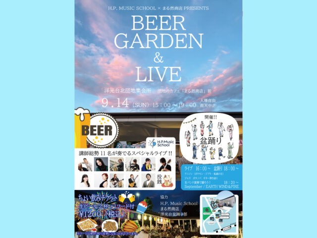 昨年9月に夕涼みライブとしてご好評いただいたビアガーデン×ライブのイベント! 今年も講師総勢11名と共に、夏の夕暮れに楽しく盛り上がりに来ませんか🍻 15:00~ビアガーデンスタート!16:00~ライブ開始!18:00~…